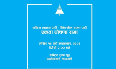 राष्ट्रिय स्वतन्त्र पार्टी (रास्वपा) र विवेकशील साझाको औपचारिक रूपमा आज पार्टी एकता घोषणा हुँदैछ । आज दिउँसो राष्ट्रिय सभागृहमा एकता