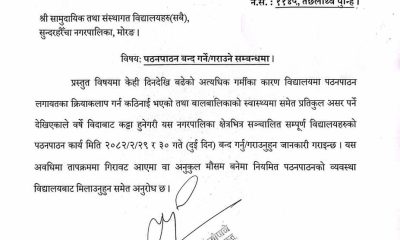 मोरंग जिल्लाको सुन्दरहरैंचाका नगरपालिकाले अत्यधिक गर्मीका कारण विद्यालयमा पठनपाठन गर्न कठिन भएको भन्दै सम्पूर्ण विद्यालय दुई दिनका लागि बन्द गर्ने निर्णय गरेको छ। नगर कार्यपालिकाको कार्यालयबाट...