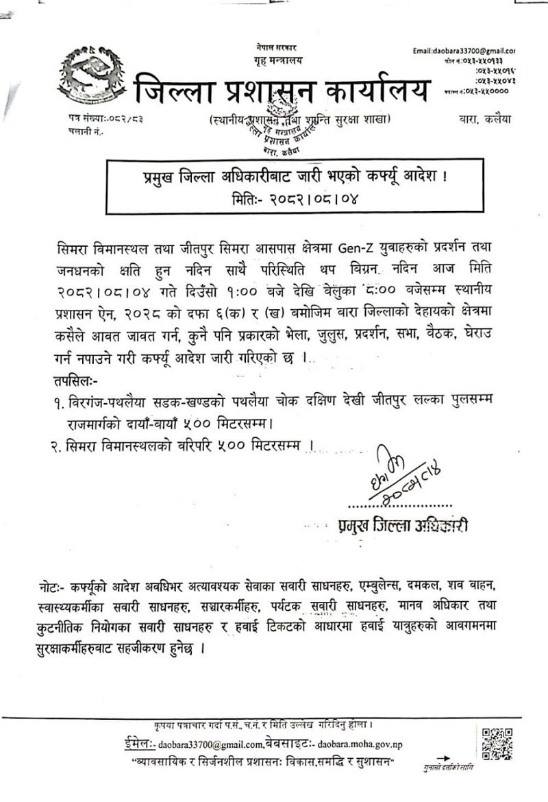 प्रमुख जिल्ला अधिकारी धर्मेन्द्रकुमार मिश्रले जारी गर्नुभएको सूचनामा सिमरा विमानस्थल र आसपासको क्षेत्रमा आज दिउँसो १ बजेदेखि बेलुका ८ बजेसम्म लागू हुने गरी कर्फ्यु लगाएको उल्लेख छ । अहिले पनि सिमरा क्षेत्र तनावग्रस्त छ ।