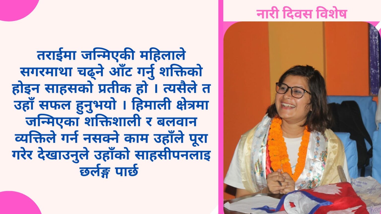 उहाँका अनुसार सगरमाथा चढ्ने क्रममा जतिजति माथि पुग्यो उतिउति नै कम शब्द मन मष्तिष्कमा आउँथे । आफू जाँदै गरेको ठाउँ पृथ्वीको सबैभन्दा अग्लो ठाउँ भएको सम्झिँदा उहाँ त्यसै रोमाञ्चित हुनुहुन्थ्यो । महिला भएर पनि केही गर्न सक्छन् भन्ने सन्देश दिन र पुरुष पुग्ने ठाउँमा महिला पनि पुग्न सक्षम छन् भन्ने उदाहरण दिन पनि सगरमाथा चढेको बताउने उहाँ सगरमाथालाई शक्तिको स्वरूप मान्नुहुन्छ ।