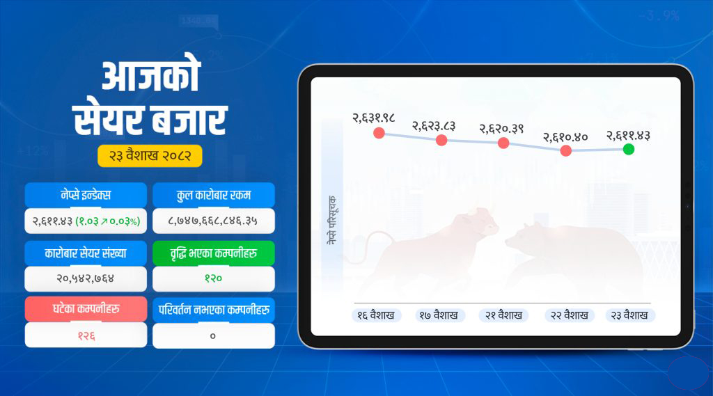 २३ वैशाख, काठमाडौं । साताको तेस्रो कारोबार दिन मंगलबार सेयर बजार सामान्य बढेर बन्द भएको छ । यस दिन १.०३ अंकले बढेको बजार २६११.४३ बिन्दुमा पुगेर रोकियो । यो ०.०३ प्रतिशत वृद्धि हो ।