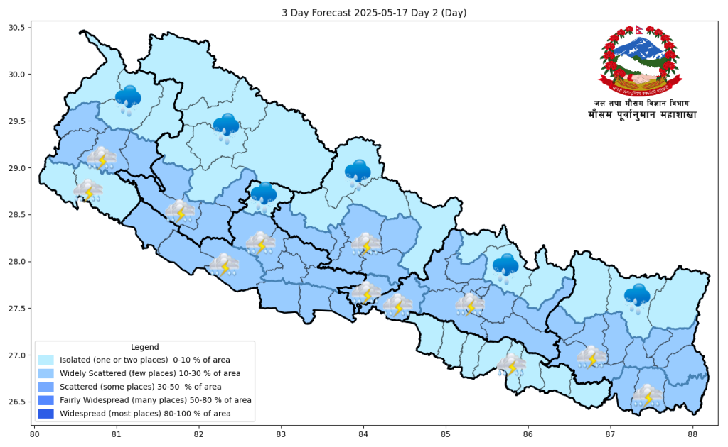 कोशी, मधेश, बागमती, गण्डकी र लुम्बिनी प्रदेशलगायत बाँकी प्रदेशका पहाडी भू-भागका थोरै स्थानहरूमा र बाँकी भू-भागका एक-दुई स्थानमा मेघगर्जन/चट्याङ्ग सँगै हल्कादेखि मध्यम वर्षाको सम्भावना रहेको छ ।