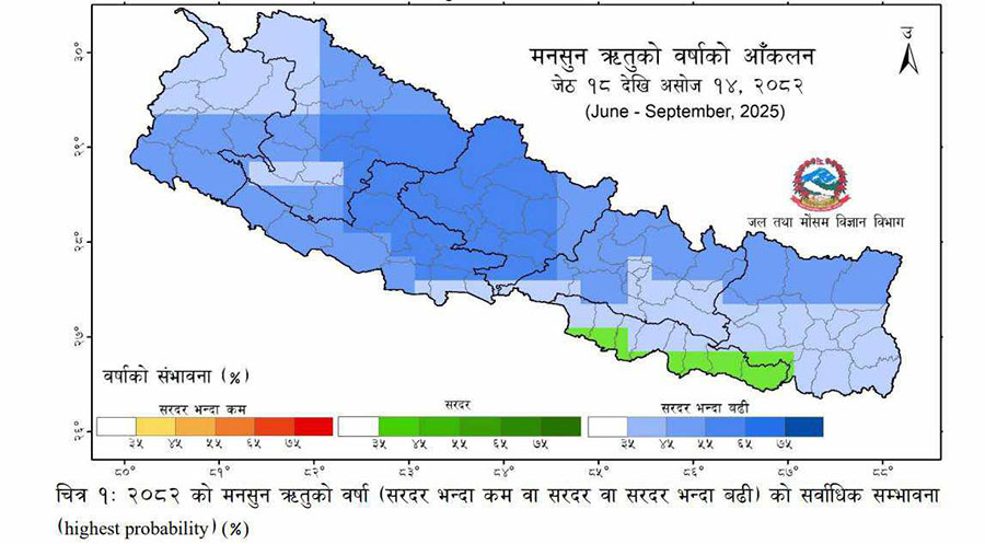 यस वर्ष नेपालको पूर्वी भागमा औसत, मध्य नेपालमा औसतभन्दा केही धेरै तथा पश्चिममा औसतभन्दा धेरै वर्षा हुने देखिन्छ । त्यसैले ती क्षेत्रलाई नीलो र गाढा नीलो रंगले संकेत गरिएको छ ।