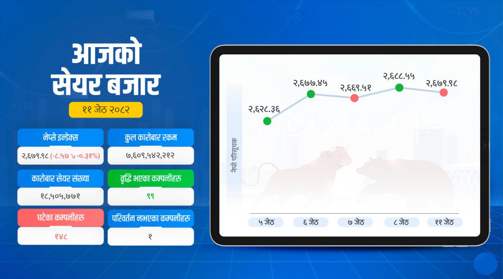 ११ जेठ, काठमाडौं । साताको पहिलो दिन आइतबार सेयर बजार ८.५७ अंक घटेको छ । सो अंकको कमीपछि नेप्से परिसूचक २६७९ अंकमा कायम भएको छ ।