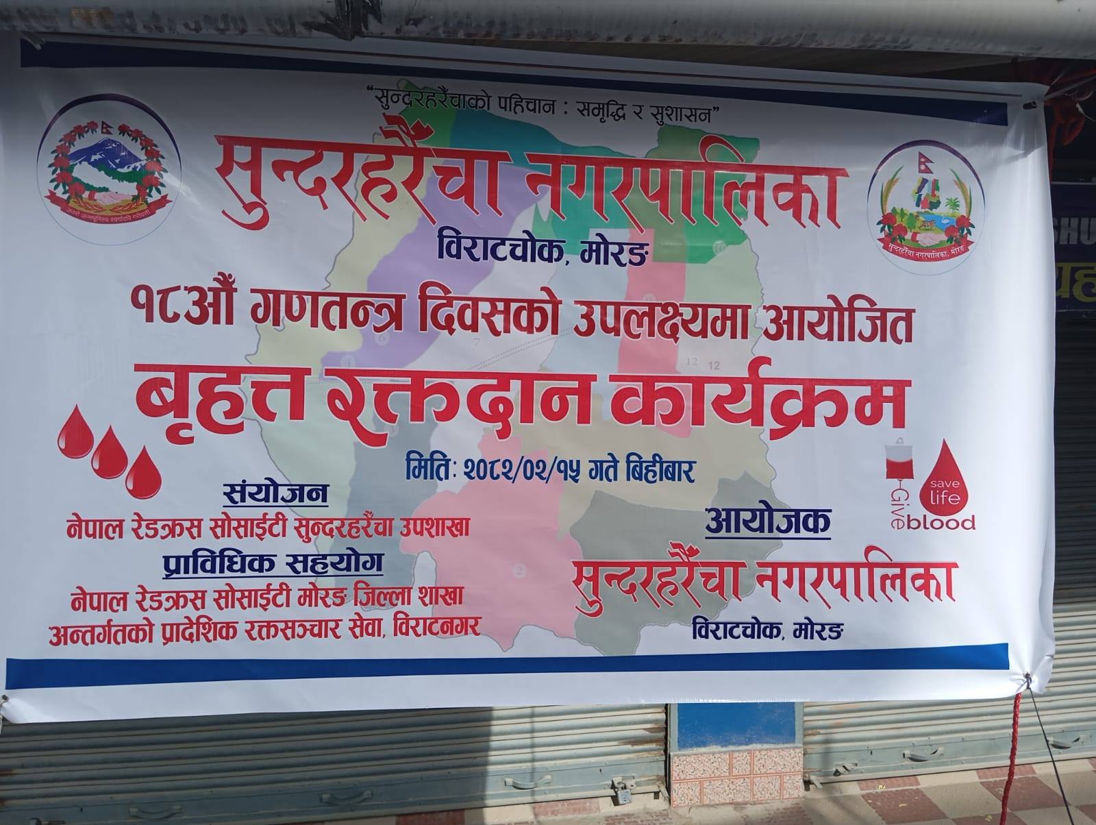 १८ औं गणतन्त्र दिवसको अवसरमा सुन्दरहरैचा नगरपालिकाको आयोजनामा रक्तदान कार्यक्रम सम्पन्न गरिएको छ। कार्यक्रम नेपाल रेडक्रस सोसाइटी, सुन्दरहरैचा उपशाखाको समन्वयमा सञ्चालन गरिएको हो । कार्यक्रमको उद्घाटन नगर प्रमुख केदारप्रसाद गुरागाईंले गर्नुभएको थियो । उहाँले गणतन्त्र दिवसको अवसरमा समाजप्रति उत्तरदायी कार्य गर्दै युवापुस्तामा रक्तदानजस्ता मानवीय सेवामा सहभागी हुन प्रेरणा मिल्ने विश्वास व्यक्त गर्नुभयो ।कार्यक्रममा स्थानीय समाजसेवी, युवाहरू, सुरक्षाकर्मी, कर्मचारी, विभिन्न संघसंस्थाका प्रतिनिधिहरूको उल्लेखनीय उपस्थिति रहेको थियो । कार्यक्रम मार्फत स्वेच्छिक रक्तदानको सन्देश फैलाउनुका साथै रक्त आवश्यक परेमा आपत्कालीन अवस्थामा सहज रूपमा उपलब्ध गराउने उद्देश्य लिएको बताइएको छ । कार्यक्रममा ५९ पिन्ट रगत संकलन भएको थियो ।
