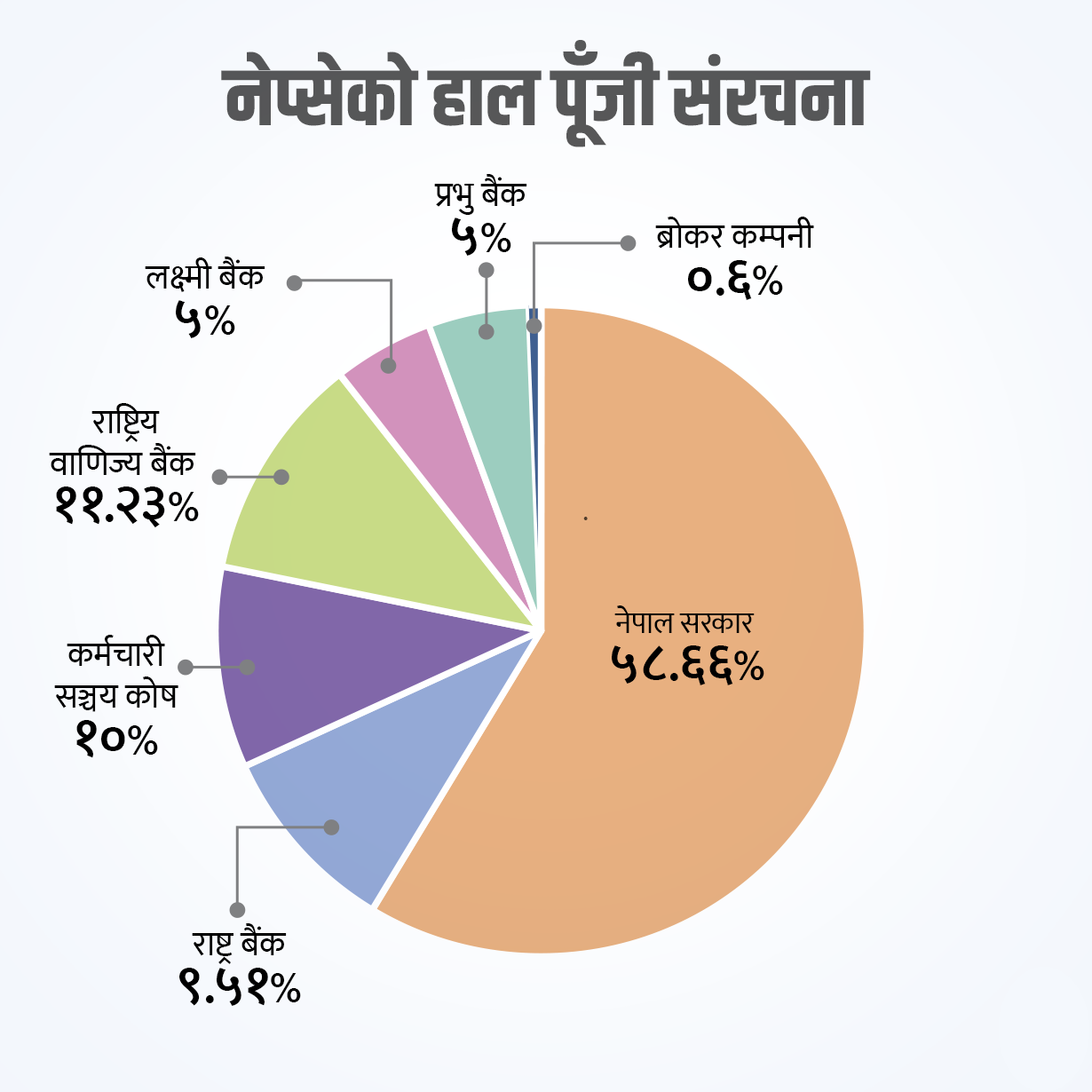 हाल नेप्सेमा राष्ट्र बैंकको सेयर हिस्सा ९.५१, कर्मचारी सञ्चय कोषको १०, राष्ट्रिय वाणिज्य बैंकको ११.२३, लक्ष्मी सनराइज बैंकको ५, प्रभु बैंकको ५ तथा ब्रोकर कम्पनीको ०.६ प्रतिशत हिस्सा छ । बाँकी ५८.६६ प्रतिशत सरकारको छ । सरकारको यो हिस्सा घटाएर विदेशी रणनीतिक साझेदार, सार्वजनिक संस्थान, बैंक, बीमा तथा सर्वसाधारणलाई सेयर दिने योजना नेप्सेको छ ।
