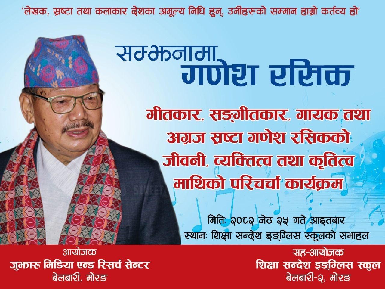 मोरङ । मोरङको बेलबारीमा ‘सम्झनामा गणेश रसिक’ कार्यक्रम सम्पन्न भएको छ । दिवङ्गत गीतकार, सङ्गीतकार, गायक तथा अग्रज स्रष्टा गणेश रसिकको जीवनी, व्यक्तित्व तथा कृतित्वमाथिको चर्चा गरेर उक्त कार्यक्रम सम्पन्न गरिएको हो ।