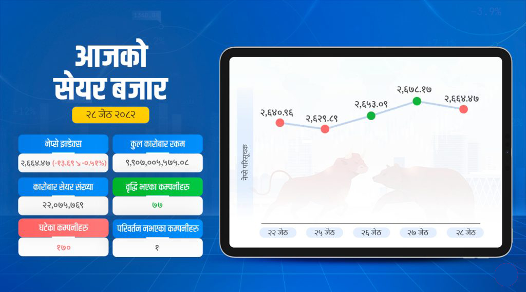 सो गिरावटपछि नेप्से २६६४ अंकमा कायम भएको छ । कारोबार रकम सामान्य घटेको छ । अघिल्लो दिन १० अर्ब १६ करोडको कारोबार भएकोमा आज ९ अर्ब ९० करोडको भयो । ७७ कम्पनीको मूल्य बढ्दा १७० को घट्यो भने एउटाको स्थिर रह्यो ।