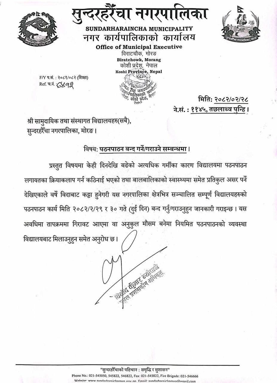 मोरंग जिल्लाको सुन्दरहरैंचाका नगरपालिकाले अत्यधिक गर्मीका कारण विद्यालयमा पठनपाठन गर्न कठिन भएको भन्दै सम्पूर्ण विद्यालय दुई दिनका लागि बन्द गर्ने निर्णय गरेको छ।