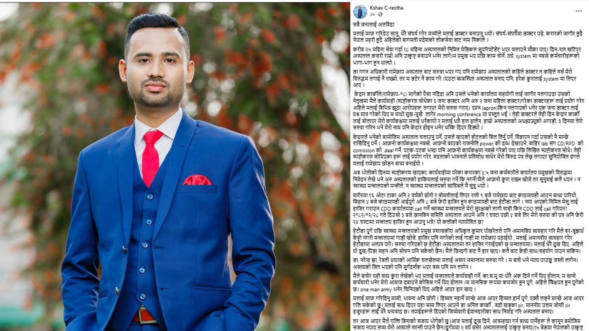 दुई वर्षभन्दा बढी समय रामेछाप जिल्ला अस्पतालमा काम गरेका उनी जेठ अन्तिम साता हेटौँडा सरुवा भएका थिए । आफूले सेवा गरेको रामेछाप अस्पतालबाटै आफूमाथि अमानवीय व्यवहार र अन्याय गरिएको उनले फेसबुक पोस्टमा लेखेका छन् ।