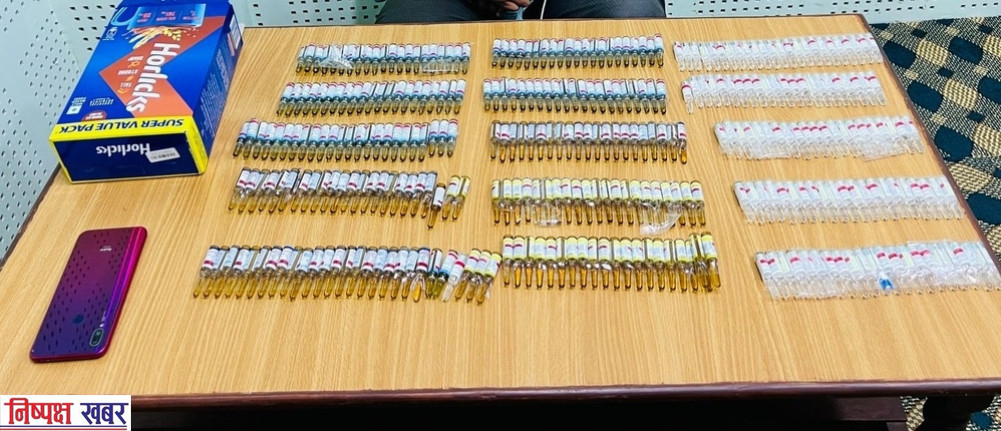 विकले ई–रिक्सामा राखी सेतो रंगको प्लास्टिकभित्र हर्लिक्स लेखिएको निलो रंगको कुटको डब्बामा लुकाई ल्याउँदै गरेको प्रतिबन्धित लागूऔषध फेनेरागन इन्जेक्सन ११० एम्पुल, बुप्रेनोर्फिन इन्जेक्सन ११० एम्पुल, सेरेज्याक डाइजेपाम इन्जेक्सन ६४ एम्पुल र डाइजेपाम इन्जेक्सन ४६ एम्पुल बरामद गरिएको डीएसपी रायले बताए।