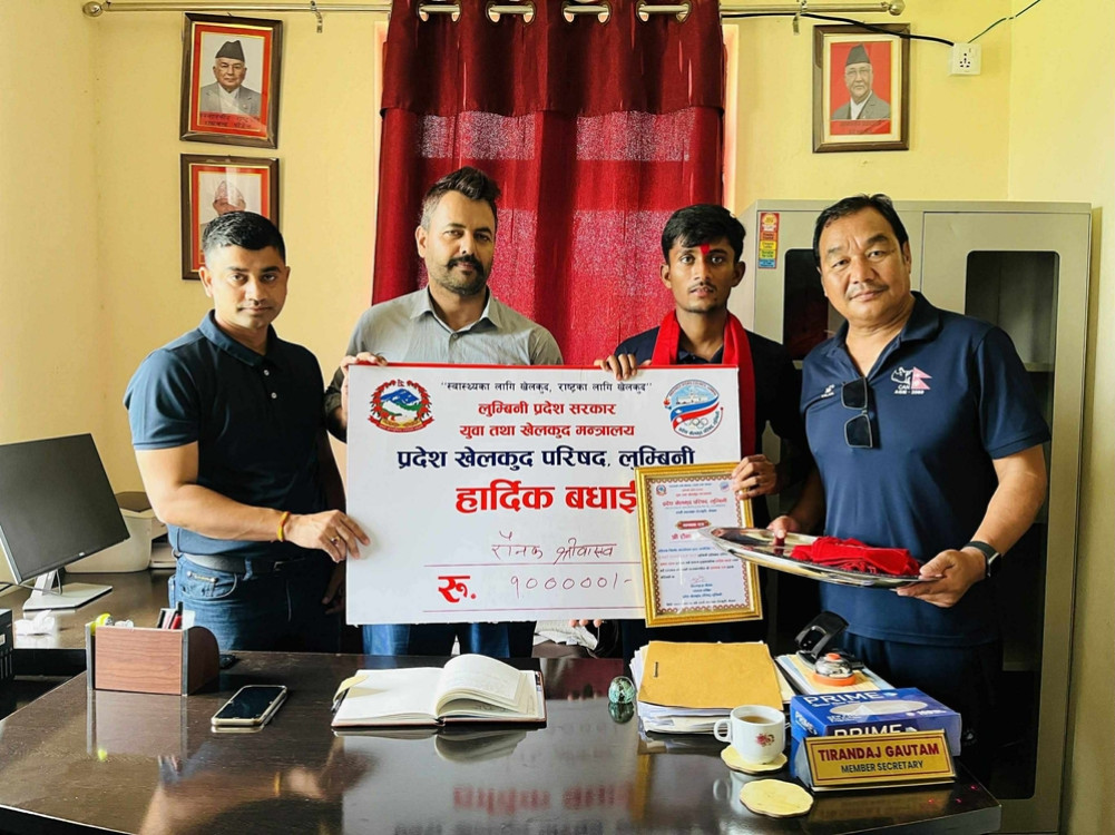 लुम्बिनी प्रदेश खेलकुद परिषद्ले प्रतिखेलाडी एक लाख र प्रशिक्षकलाई ५० हजार रुपैयाँ प्रदान गरी सम्मान गरेको हो ।