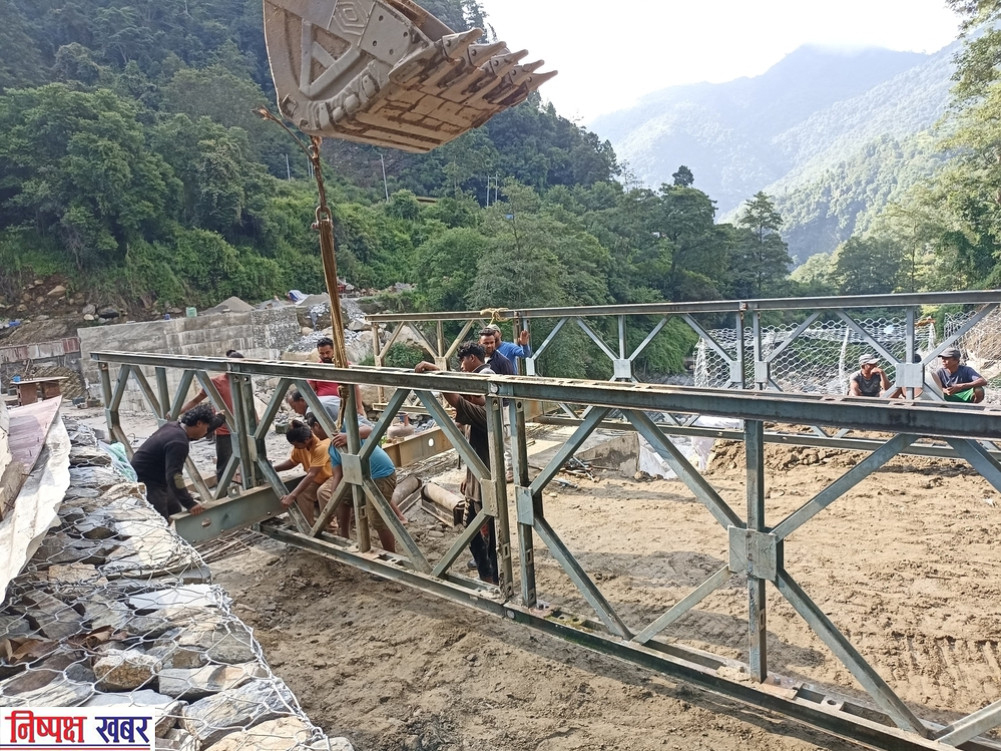 बेलिब्रिज जडान गर्न एक साता लाग्ने र पुल भएर सवारीसाधन सञ्चालनमा आउन बढीमा दुई साता लाग्ने यातायात पूर्वाधार निर्देशनालय हेटौंडाका प्रमुख नभिन सिंहले बताए । ‘ आइतबार बिहानदेखि दक्ष जनशक्ति र आवश्यक उपकरण प्रयोग गरेर बेलिब्रिज जडानको काम भइरहेको छ,’ उनले भने ।