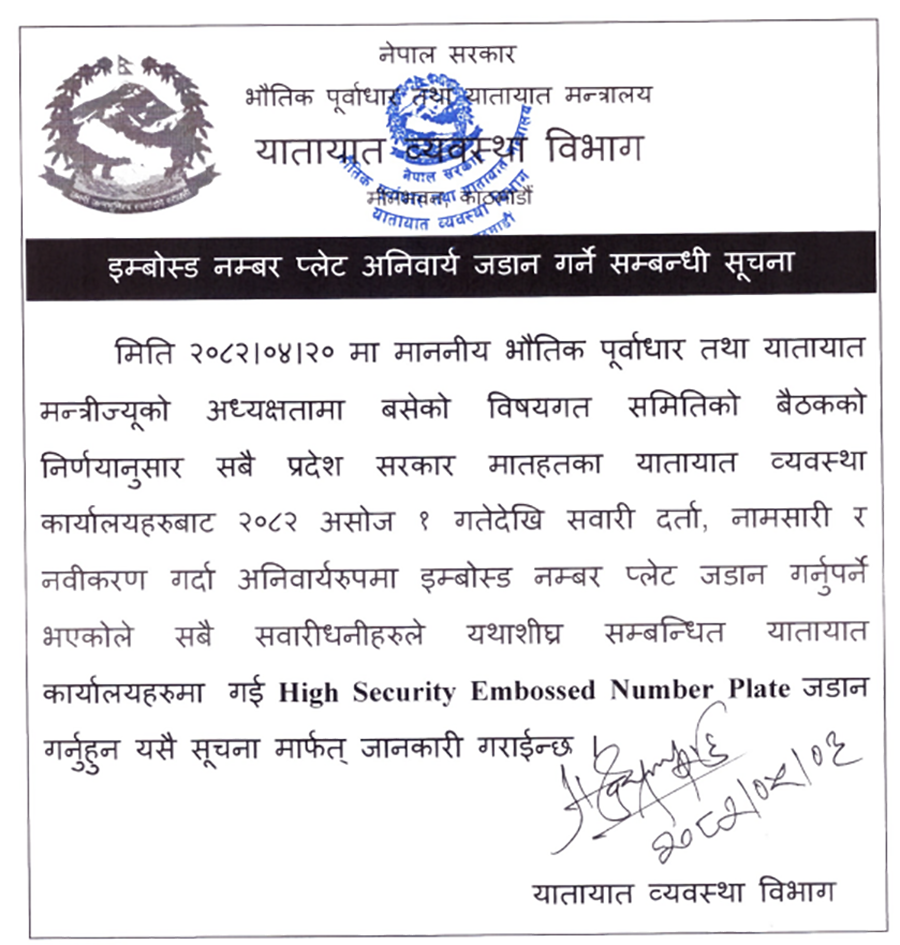 गत २० साउनमा बसेको विषयगत समितिको बैठकले १ असोजदेखि सवारीसाधनहरूमा इम्बोस्ड नम्बर प्लेट जडान अनिवार्य गर्ने निर्णय गरेको थियो ।