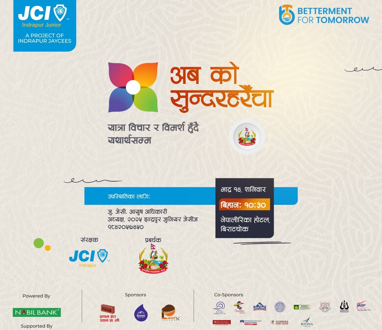 इन्द्रपुर जुनियर जेसिजको आयोजनामा आगामी भदौ १४ गते शनिबार बिहान १०:३० बजे बिराटचोकस्थित नेपालिरिका होटलमा कार्यक्रम हुने इन्द्रपुर जुनियर जेसिजका अध्यक्ष आयुस अधिकारीले बताए।