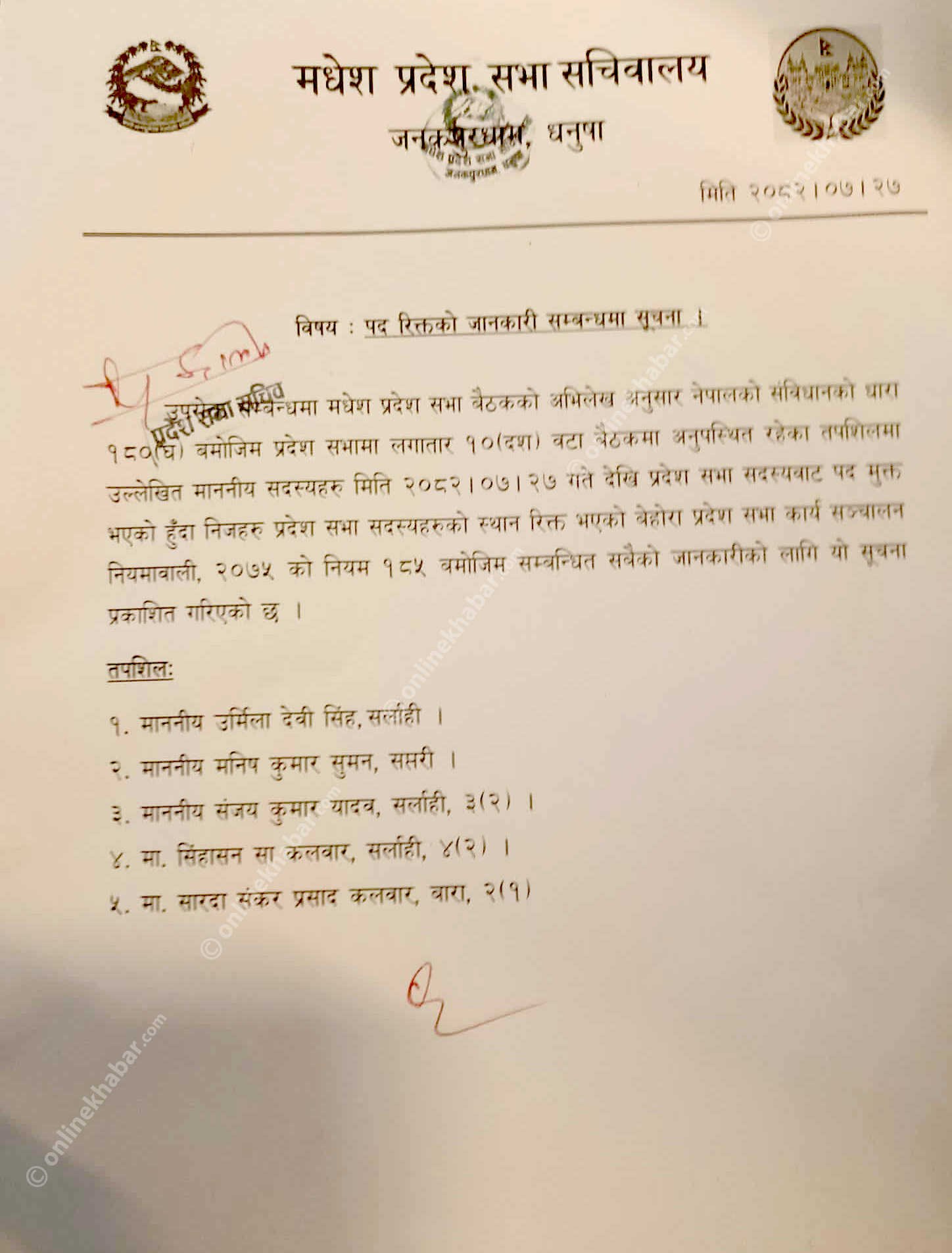 उनीहरूलाई पदमुक्त गरिएको सूचना सभामुखले निकालेका छन् । संविधानमा मधेश प्रदेश सभा बैठकको अभिलेख अनुसार नेपालको संविधानको धारा १८० यो बमोजिम प्रदेश सभामा लगातार १० (दश) वटा बैठकमा अनुपस्थित रहेका तपशिलमा उल्लेखित माननीय सदस्यहरु मिति २०८२।०७।२७ गते देखि प्रदेश सभा सदस्यबाट पद मुक्त भएको हुँदा निजहरू प्रदेश सभा सदस्यहरुको स्थान रिक्त भएको बेहोरा प्रदेश सभा कार्य सञ्चालन नियमावाली, २०७५ को नियम १८५ बमोजिम सम्बन्धित सबैको जानकारीको लागि यो सूचना प्रकाशित गरिएको छ ।’ सूचनामा उल्लेख छ ।