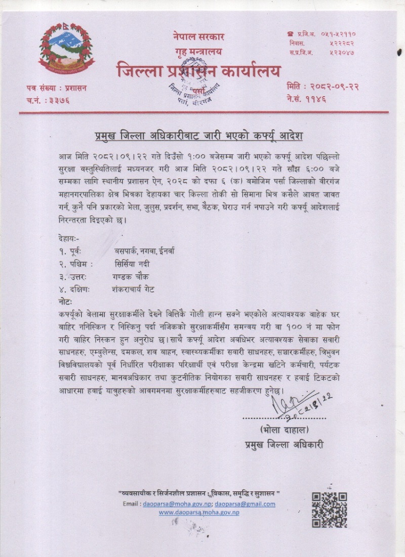 वीरगञ्जमा जारी कर्फ्यू आज बेलुकी ६ बजेसम्म
