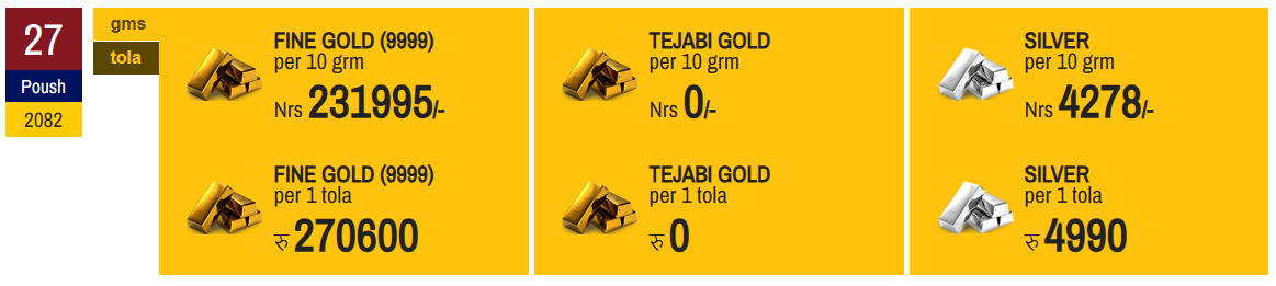 आइतबार नेपाली बजारमा सुन र चाँदीको मूल्य बढेको छ। यस दिन सुन प्रतितोला २ हजार ८०० रुपैयाँले बढेको छ भने चाँदीको मूल्यले तोलामा २१० रुपैयाँ बढेर नयाँ रेकर्ड बनाएकाे छ। नेपाल सुनचाँदी व्यवसायी महासंघका अनुसार आज सुन प्रतितोला २ लाख ७० हजार ६०० रुपैयाँमा कारोबार भइरहेको छ। गत शुक्रबारको बजारमा सुनको मूल्य प्रतितोला २ लाख ६७ हजार ८०० रुपैयाँमा कारोबार भएको थियो।